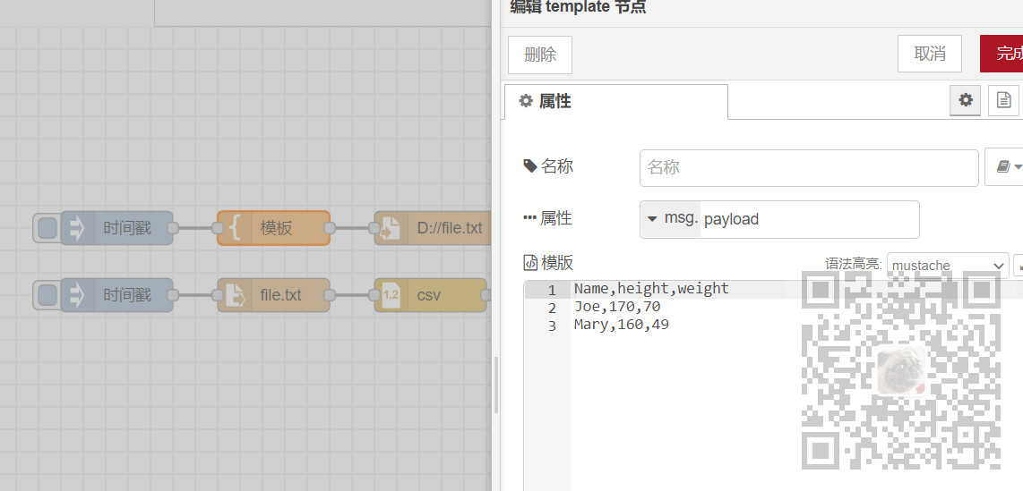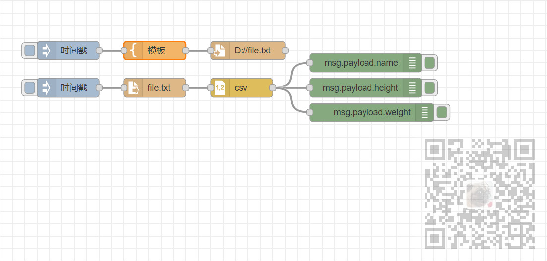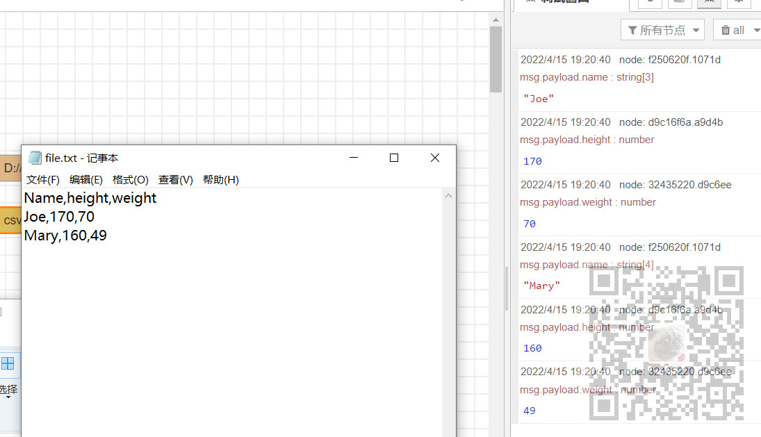 [ { "id": "f4a4d8eab7935bc8", "type": "tab", "label": "流程 3", "disabled": false, "info": "", "env": [] }, { "id": "c428312d1f6165d1", "type": "mqtt-broker", "name": "mqtt", "broker": "127.0.0.1", "port": "1883", "clientid": "", "autoConnect": true, "usetls": false, "protocolVersion": "4", "keepalive": "60", "cleansession": true, "birthTopic": "", "birthQos": "0", "birthPayload": "", "birthMsg": {}, "closeTopic": "", "closeQos": "0", "closePayload": "", "closeMsg": {}, "willTopic": "", "willQos": "0", "willPayload": "", "willMsg": {}, "sessionExpiry": "" }, { "id": "51eee50b4ec9422f", "type": "ui_group", "name": "dashboardDemo", "tab": "29ae4c620f43ee0d", "order": 1, "disp": true, "width": "6", "collapse": false, "className": "" }, { "id": "29ae4c620f43ee0d", "type": "ui_tab", "name": "Home", "icon": "dashboard", "disabled": false, "hidden": false }, { "id": "a506c767a5c1edbd", "type": "ui_base", "theme": { "name": "theme-light", "lightTheme": { "default": "#0094CE", "baseColor": "#0094CE", "baseFont": "-apple-system,BlinkMacSystemFont,Segoe UI,Roboto,Oxygen-Sans,Ubuntu,Cantarell,Helvetica Neue,sans-serif", "edited": true, "reset": false }, "darkTheme": { "default": "#097479", "baseColor": "#097479", "baseFont": "-apple-system,BlinkMacSystemFont,Segoe UI,Roboto,Oxygen-Sans,Ubuntu,Cantarell,Helvetica Neue,sans-serif", "edited": false }, "customTheme": { "name": "Untitled Theme 1", "default": "#4B7930", "baseColor": "#4B7930", "baseFont": "-apple-system,BlinkMacSystemFont,Segoe UI,Roboto,Oxygen-Sans,Ubuntu,Cantarell,Helvetica Neue,sans-serif" }, "themeState": { "base-color": { "default": "#0094CE", "value": "#0094CE", "edited": false }, "page-titlebar-backgroundColor": { "value": "#0094CE", "edited": false }, "page-backgroundColor": { "value": "#fafafa", "edited": false }, "page-sidebar-backgroundColor": { "value": "#ffffff", "edited": false }, "group-textColor": { "value": "#1bbfff", "edited": false }, "group-borderColor": { "value": "#ffffff", "edited": false }, "group-backgroundColor": { "value": "#ffffff", "edited": false }, "widget-textColor": { "value": "#111111", "edited": false }, "widget-backgroundColor": { "value": "#0094ce", "edited": false }, "widget-borderColor": { "value": "#ffffff", "edited": false }, "base-font": { "value": "-apple-system,BlinkMacSystemFont,Segoe UI,Roboto,Oxygen-Sans,Ubuntu,Cantarell,Helvetica Neue,sans-serif" } }, "angularTheme": { "primary": "indigo", "accents": "blue", "warn": "red", "background": "grey", "palette": "light" } }, "site": { "name": "Node-RED Dashboard", "hideToolbar": "false", "allowSwipe": "false", "lockMenu": "false", "allowTempTheme": "true", "dateFormat": "DD/MM/YYYY", "sizes": { "sx": 48, "sy": 48, "gx": 6, "gy": 6, "cx": 6, "cy": 6, "px": 0, "py": 0 } } }, { "id": "248cbbb0.18e794", "type": "ui_group", "name": "MyGroup", "tab": "3f79c420.cfc1bc", "order": 1, "disp": true, "width": "6", "collapse": false }, { "id": "3f79c420.cfc1bc", "type": "ui_tab", "name": "Home", "icon": "dashboard", "disabled": false, "hidden": false }, { "id": "a0954be5.a7f7e8", "type": "ui_group", "name": "MyInput", "tab": "3f79c420.cfc1bc", "order": 2, "disp": true, "width": "6", "collapse": false }, { "id": "508bd6f8398ab80f", "type": "ui_group", "name": "OpenWeatherMap", "tab": "3f79c420.cfc1bc", "order": 3, "disp": true, "width": "6", "collapse": false }, { "id": "8824dea1.83e31", "type": "websocket-client", "path": "ws://localhost:9898/", "tls": "", "wholemsg": "false" }, { "id": "f9c23ff5.026e", "type": "file", "z": "f4a4d8eab7935bc8", "name": "", "filename": "D://file.txt", "appendNewline": true, "createDir": false, "overwriteFile": "true", "encoding": "utf8", "x": 480, "y": 180, "wires": [ [] ] }, { "id": "2ebfe992.fdc746", "type": "inject", "z": "f4a4d8eab7935bc8", "name": "", "repeat": "", "crontab": "", "once": false, "onceDelay": 0.1, "topic": "", "payload": "", "payloadType": "date", "x": 190, "y": 240, "wires": [ [ "cfaafb8.012a108" ] ] }, { "id": "cfaafb8.012a108", "type": "file in", "z": "f4a4d8eab7935bc8", "name": "", "filename": "D://file.txt", "format": "utf8", "chunk": false, "sendError": false, "encoding": "utf8", "allProps": false, "x": 340, "y": 240, "wires": [ [ "ee4f2b44.0fc328" ] ] }, { "id": "32435220.d9c6ee", "type": "debug", "z": "f4a4d8eab7935bc8", "name": "", "active": true, "tosidebar": true, "console": false, "tostatus": false, "complete": "payload.weight", "targetType": "msg", "statusVal": "", "statusType": "auto", "x": 680, "y": 280, "wires": [] }, { "id": "ee4f2b44.0fc328", "type": "csv", "z": "f4a4d8eab7935bc8", "name": "", "sep": ",", "hdrin": "", "hdrout": "none", "multi": "one", "ret": "\\n", "temp": "name,height,weight", "skip": "1", "strings": true, "include_empty_strings": "", "include_null_values": "", "x": 470, "y": 240, "wires": [ [ "f250620f.1071d", "d9c16f6a.a9d4b", "32435220.d9c6ee" ] ] }, { "id": "f250620f.1071d", "type": "debug", "z": "f4a4d8eab7935bc8", "name": "", "active": true, "tosidebar": true, "console": false, "tostatus": false, "complete": "payload.name", "targetType": "msg", "statusVal": "", "statusType": "auto", "x": 670, "y": 200, "wires": [] }, { "id": "d9c16f6a.a9d4b", "type": "debug", "z": "f4a4d8eab7935bc8", "name": "", "active": true, "tosidebar": true, "console": false, "tostatus": false, "complete": "payload.height", "targetType": "msg", "statusVal": "", "statusType": "auto", "x": 670, "y": 240, "wires": [] }, { "id": "277f6cb6.89e434", "type": "template", "z": "f4a4d8eab7935bc8", "name": "", "field": "payload", "fieldType": "msg", "format": "handlebars", "syntax": "mustache", "template": "Name,height,weight\nJoe,170,70\nMary,160,49", "output": "str", "x": 330, "y": 180, "wires": [ [ "f9c23ff5.026e" ] ] }, { "id": "f22a93b5.26844", "type": "inject", "z": "f4a4d8eab7935bc8", "name": "", "props": [ { "p": "payload" }, { "p": "topic", "vt": "str" } ], "repeat": "", "crontab": "", "once": false, "onceDelay": 0.1, "topic": "", "payloadType": "date", "x": 190, "y": 180, "wires": [ [ "277f6cb6.8
