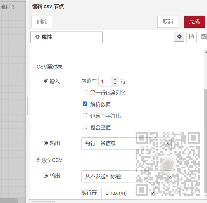 5、csv节点,剖析csv资料,输入列名,分隔符是逗号,因为第一列是标题列,所以在输入时忽略第一行